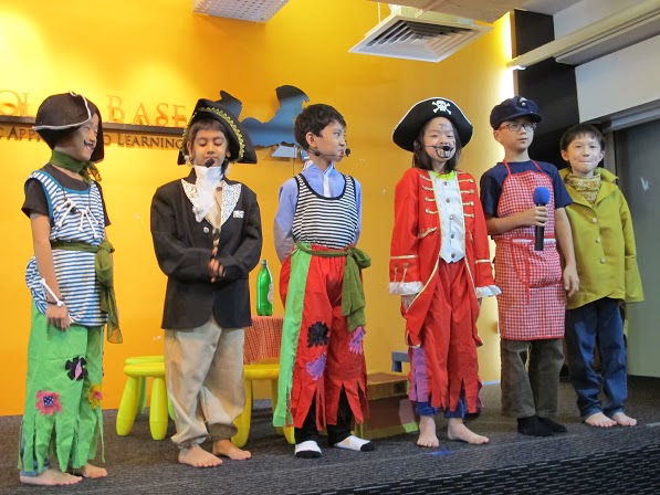 The child needs to memorise what needs to be presented, and sometimes with the help of using pictures, action or props. Fluency in English helps in presenting as the child sometimes uses his own words.